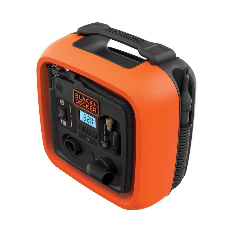 De BLACK+DECKER ASI400-XJ Compressor is ideaal wanneer je op reis bent met de auto en een compressor nodig hebt voor het oppompen van grotere opblaasbare artikelen of accessoires zoals bijvoorbeeld sport accessoires en banden. Om de compressor te gebruiken sluit je deze aan op een 12V DC sigarettenaansluiting. Dankzij het digitale scherm kan de actule druk nauwkeurig worden afgelezen en is het instellen van de benodigde druk eenvoudig. Deze compressor heeft een compact ontwerp, waardoor hij makkelijk op te bergen is.