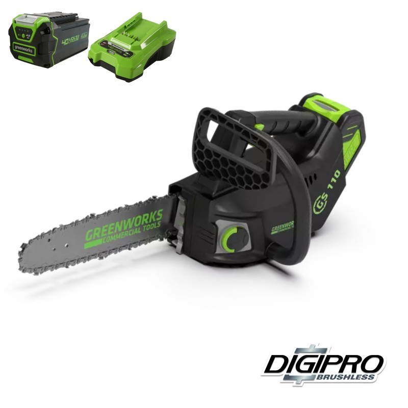 Met de Greenworks 40 volt accu tophandle kettingzaag type GD40TCSK4 heb je een zeer krachtige en compacte accu kettingzaag speciaal voor boomverzorging. De DIGIPRO koolborstel vrije motor zorgt voor 30% extra vermogen en 70% minder trillingen.