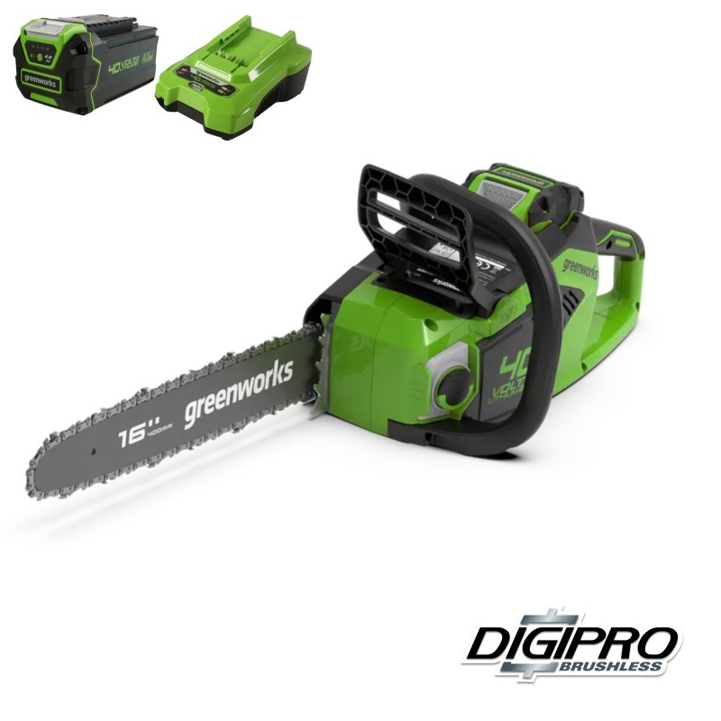 Met de Greenworks 40 volt accu kettingzaag type GD40CS18K4 heb je een zeer krachtige accu kettingzaag. De DIGIPRO koolborstel vrije motor zorgt voor 30% extra vermogen en 70% minder trillingen. De kettingzaag is gelijk aan de GD40CS18 maar wordt geleverd inclusief een 4.0Ah accu en een lader.