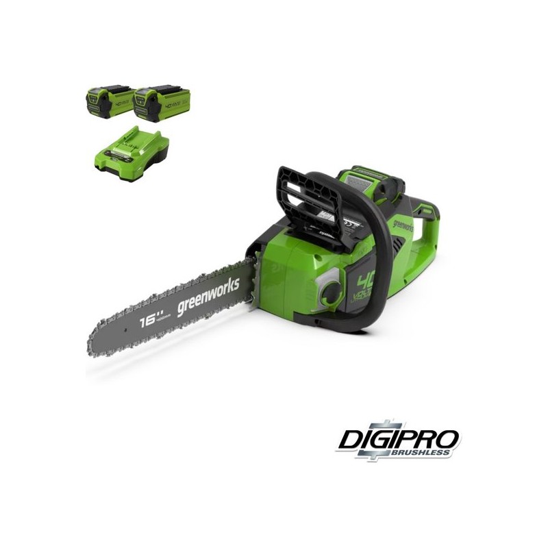 Met de Greenworks 40 volt accu kettingzaag type GD40CS18K2X heb je een zeer krachtige accu kettingzaag. De DIGIPRO koolborstel vrije motor zorgt voor 30% extra vermogen en 70% minder trillingen. De kettingzaag is gelijk aan de GD40CS18 maar wordt geleverd inclusief twee 2.0Ah accu's en een lader.
